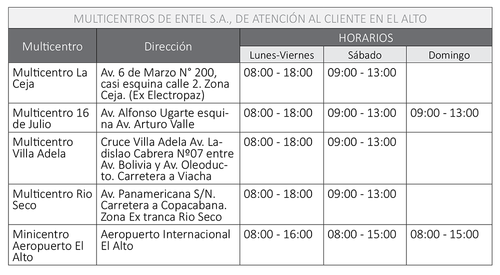 La empresa nacionalizada extiende sus servicios de atención al cliente en esa urbe a través de los Multicentros La Ceja, 16 de Julio, Villa Adela, Río Seco y el Minicentro Aeropuerto El Alto.